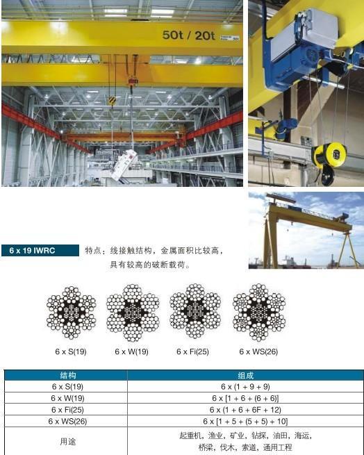 鋼絲繩一艙由數股鋼絲柬和一根繩芯捻繞而成,每一股鋼絲柬又由多根鋼絲捻繞而成;鋼絲繩的規格較多,起重工程常用的為6x19+1.6x37+1.6x61+1三種。上述二種規格中,6代表繞成鋼絲繩的股數,19(37,61)代表每股中的鋼絲數,1代表中間的麻芯。